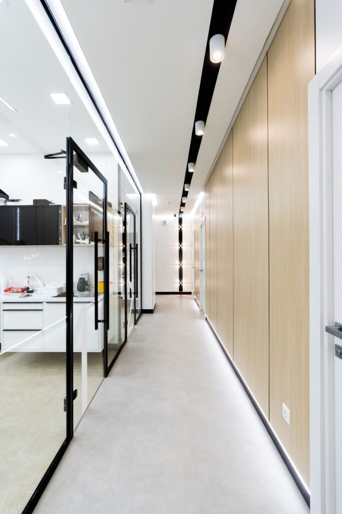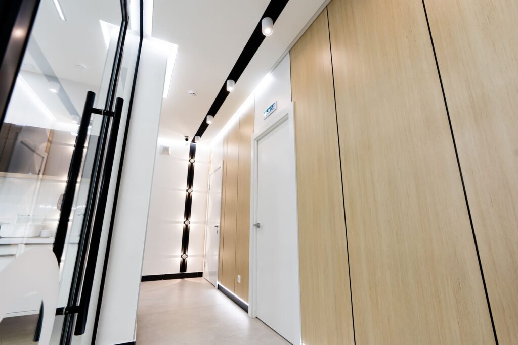 Для отделки помещений были выбраны панели «Ласпан» со скрытой кромкой, был разработан уникальный дизайн с использованием деревянных вставок и подсветки.