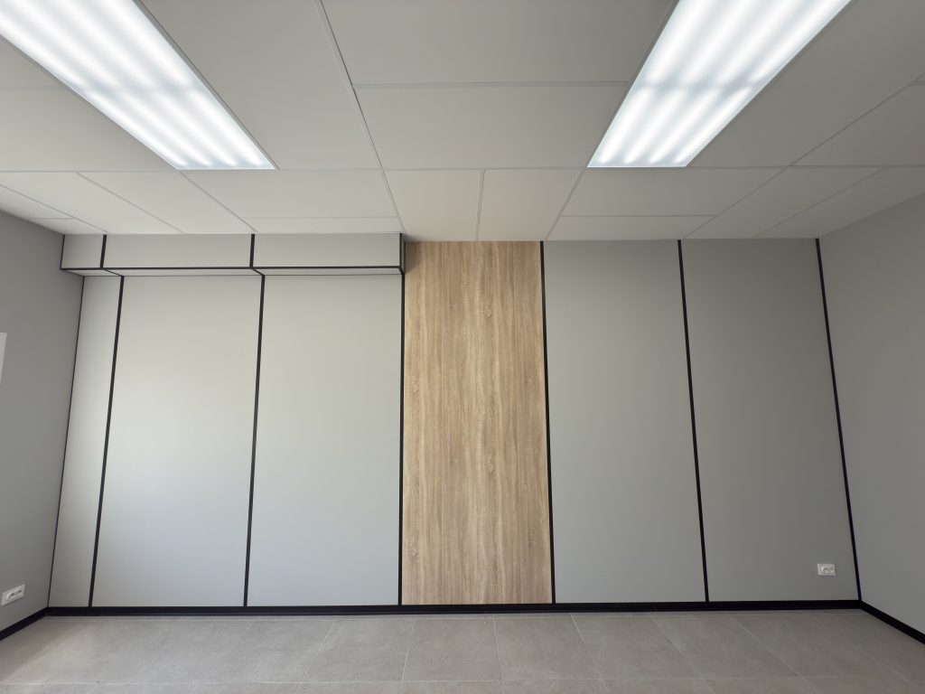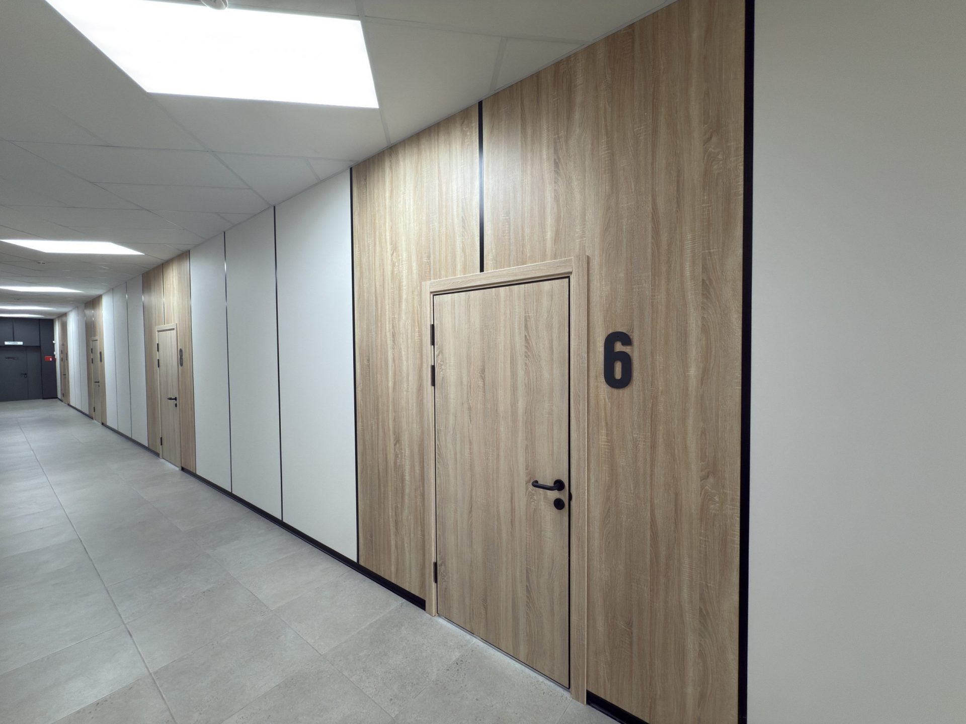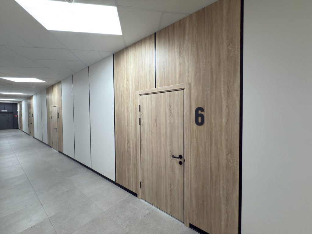Для потолка использовались стандартные потолочные плиты в классическом белом цвете RAL 9016. Фирменные двери LASPAN в декоре «Дуб Sonoma светлый» идеально дополнили интерьер, создав единый и завершенный стиль.