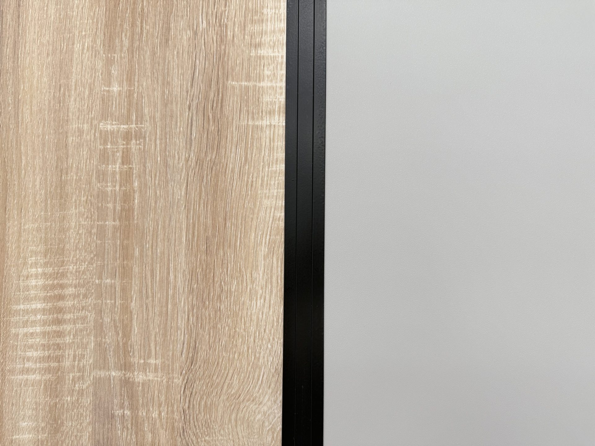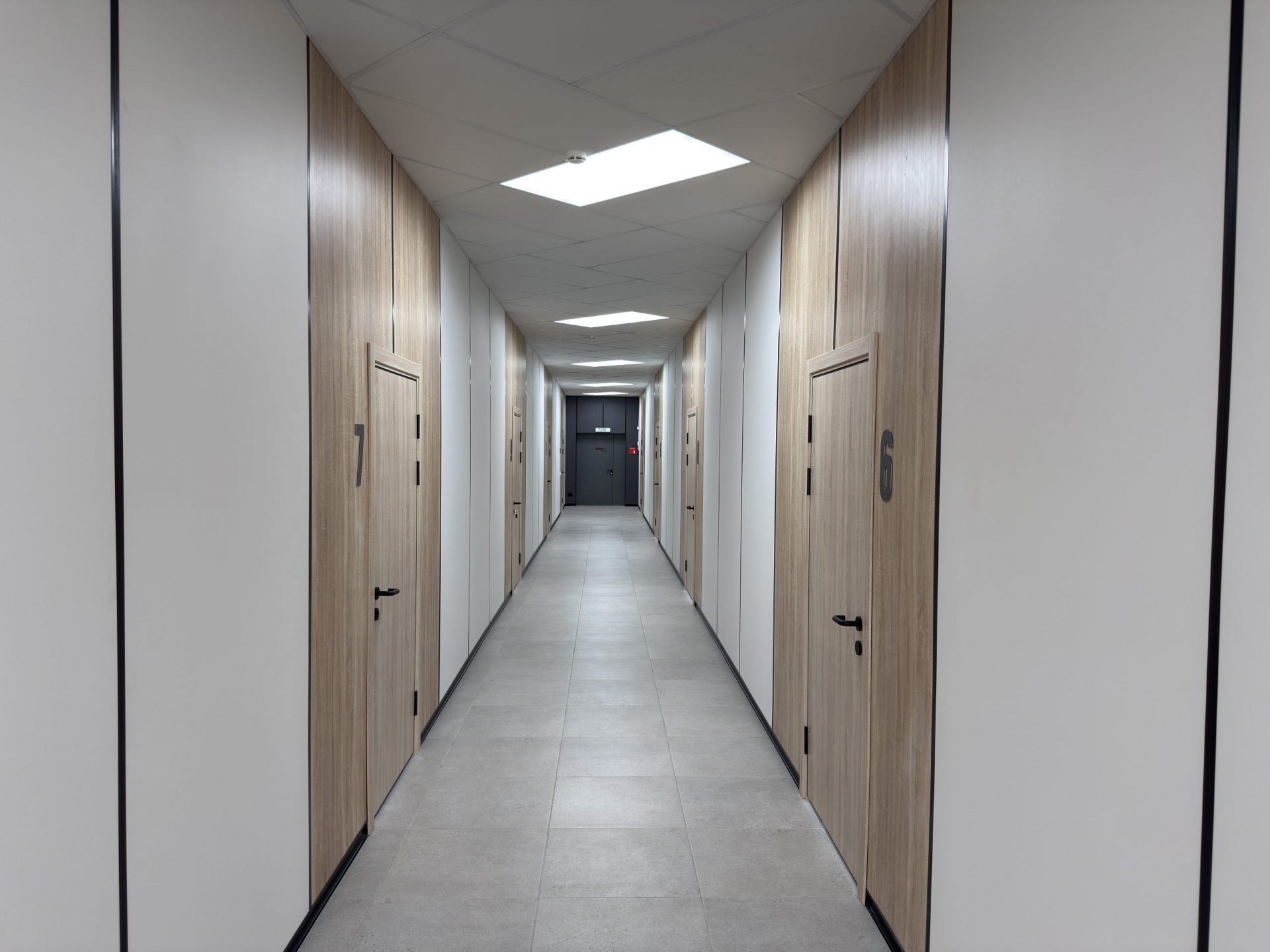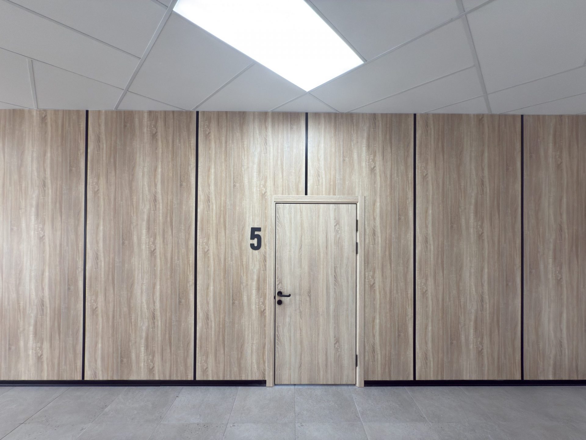 Для потолка использовались стандартные потолочные плиты в классическом белом цвете RAL 9016. Фирменные двери LASPAN в декоре «Дуб Sonoma светлый» идеально дополнили интерьер, создав единый и завершенный стиль.